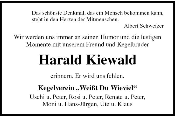 Das schönste Denkmal, das ein Mensch bekommen kann,steht in den Herzen der Mitmenschen.Albert Schweizer Wir werden uns immer an seinen Humor und die lustigen Momente mit unserem Freund und Kegelbruder Harald Kiewald erinnern. Er wird uns fehlen. Kegelverein „Weißt Du Wieviel“ Uschi u. Peter, Rosi u. Peter, Renate u. Peter,Moni u. Hans-Jürgen, Ute u. Klaus