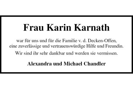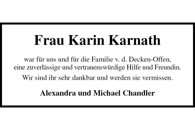 Frau Karin Karnath war für uns und für die Familie v. d. Decken-Offen, eine zuverlässige und vertrauenswürdige Hilfe und Freundin. Wir sind ihr sehr dankbar und werden sie vermissen. Alexandra und Michael Chandler