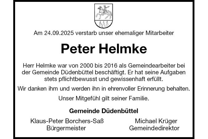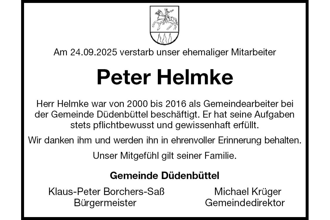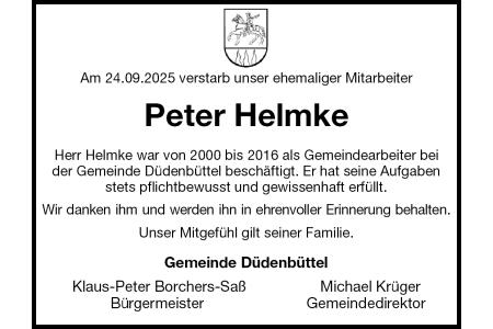 Am 24.09.2025 verstarb unser ehemaliger Mitarbeiter Peter Helmke Herr Helmke war von 2000 bis 2016 als Gemeindearbeiter beider Gemeinde Düdenbüttel beschäftigt. Er hat seine Aufgaben stets pflichtbewusst und gewissenhaft erfüllt. Wir danken ihm und werden ihn in ehrenvoller Erinnerung behalten. Unser Mitgefühl gilt seiner Familie. Gemeinde Düdenbüttel Klaus-Peter Borchers-Saß Michael Krüger Bürgermeister Gemeindedirektor