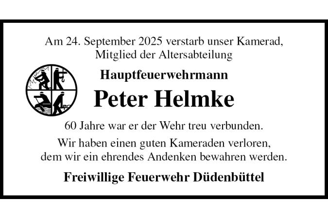 Am 24. September 2025 verstarb unser Kamerad,Mitglied der Altersabteilung Hauptfeuerwehrmann Peter Helmke 60 Jahre war er der Wehr treu verbunden. Wir haben einen guten Kameraden verloren,dem wir ein ehrendes Andenken bewahren werden. Freiwillige Feuerwehr Düdenbüttel