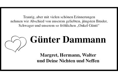 Traurig, aber mit vielen schönen Erinnerungennehmen wir Abschied von unserem geliebten, jüngsten Bruder, Schwager und unserem so fröhlichen „Onkel Günti“ Günter Dammann Margret, Hermann, Walterund Deine Nichten und Neffen