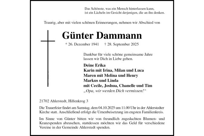 Das Schönste, was ein Mensch hinterlassen kann,ist ein Lächeln im Gesicht derjenigen, die an ihn denken. Traurig, aber mit vielen schönen Erinnerungen, nehmen wir Abschied von Günter Dammann * 26. Dezember 1941 † 28. September 2025 Dankbar für viele schöne gemeinsame Jahrelassen wir Dich in Liebe gehen. Deine ErikaKarin mit Irina, Milan und LucaMaren mit Melina und HenryMarkus und Lindamit Cecile, Joshua, Chanelle und Tim „Opa, wir werden Dich vermissen!“ 21702 Ahlerstedt, Hillenkrog 3 Die Trauerfeier findet am Samstag, dem 04.10.2025 um 11.00 Uhr in der Ahlerstedter Kirche statt. Anschließend erfolgt die Urnenbeisetzung im engsten Familienkreis. Im Sinne von Günter bitten wir von freundlich zugedachten Blumen- undKranzspenden abzusehen, stattdessen möchten wir das Geld für verschiedeneVereine in der Gemeinde Ahlerstedt spenden.