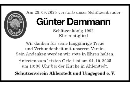 Am 28.09.2025 verstarb unser Schützenbruder Wir danken für seine langjährige Treueund Verbundenheit mit unserem Verein.Sein Andenken werden wir stets in Ehren halten. Antreten zum letzten Geleit ist am 04.10.2025um 10:30 Uhr bei der Kirche in Ahlerstedt. Schützenverein Ahlerstedt und Umgegend e. V. Günter Dammann Schützenkönig 1992 Ehrenmitglied