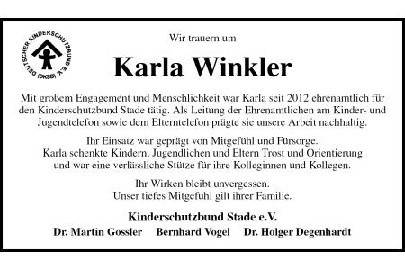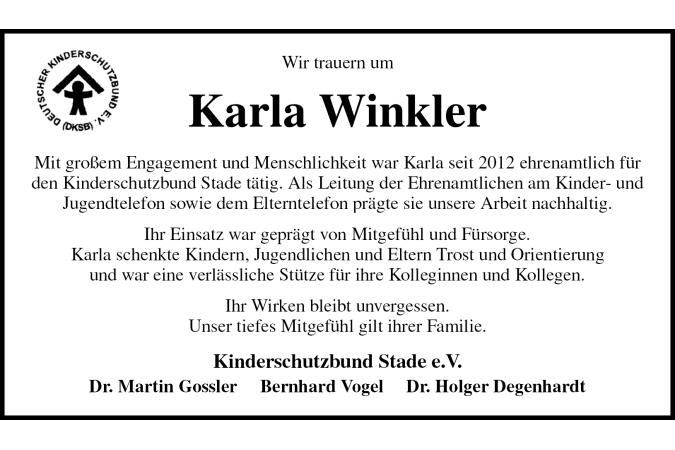 Wir trauern um Karla Winkler Mit großem Engagement und Menschlichkeit war Karla seit 2012 ehrenamtlich für den Kinderschutzbund Stade tätig. Als Leitung der Ehrenamtlichen am Kinder- und Jugendtelefon sowie dem Elterntelefon prägte sie unsere Arbeit nachhaltig. Ihr Einsatz war geprägt von Mitgefühl und Fürsorge.Karla schenkte Kindern, Jugendlichen und Eltern Trost und Orientierungund war eine verlässliche Stütze für ihre Kolleginnen und Kollegen. Ihr Wirken bleibt unvergessen.Unser tiefes Mitgefühl gilt ihrer Familie. Kinderschutzbund Stade e.V. Dr. Martin Gossler Bernhard Vogel Dr. Holger Degenhardt