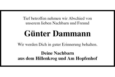 Tief betroffen nehmen wir Abschied vonunserem lieben Nachbarn und Freund Günter Dammann Wir werden Dich in guter Erinnerung behalten. Deine Nachbarnaus dem Hillenkrog und Am Hopfenhof
