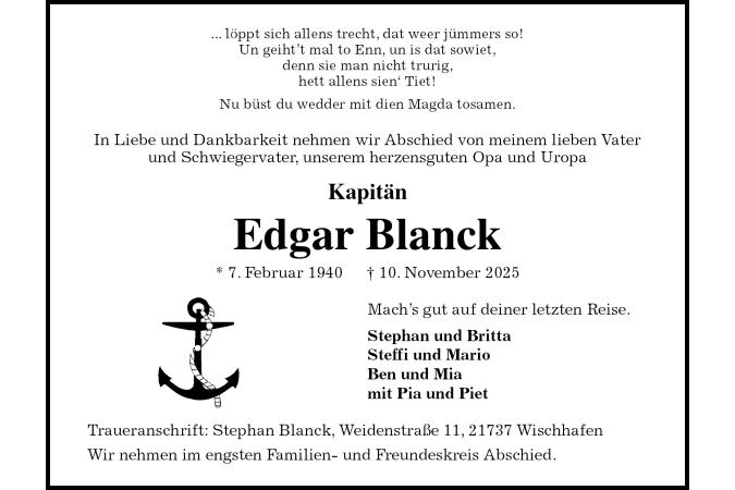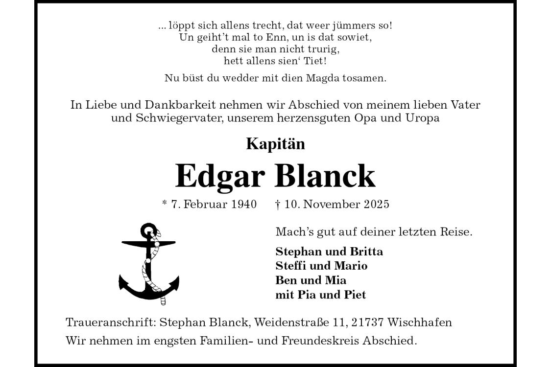... löppt sich allens trecht, dat weer jümmers so!Un geiht’t mal to Enn, un is dat sowiet,denn sie man nicht trurig,hett allens sien‘ Tiet! Nu büst du wedder mit dien Magda tosamen.In Liebe und Dankbarkeit nehmen wir Abschied von meinem lieben Vaterund Schwiegervater, unserem herzensguten Opa und Uropa Kapitän Edgar Blanck * 7. Februar 1940† 10. November 2025Mach’s gut auf deiner letzten Reise. Stephan und Britta Steffi und Mario Ben und Mia mit Pia und Piet Traueranschrift: Stephan Blanck, Weidenstraße 11, 21737 Wischhafen Wir nehmen im engsten Familien- und Freundeskreis Abschied.