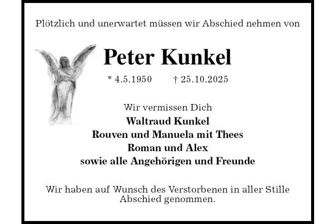 Plötzlich und unerwartet müssen wir Abschied nehmen von Peter Kunkel * 4.5.1950† 25.10.2025Wir vermissen Dich Waltraud Kunkel Rouven und Manuela mit Thees Roman und Alex sowie alle Angehörigen und Freunde Wir haben auf Wunsch des Verstorbenen in aller StilleAbschied genommen.