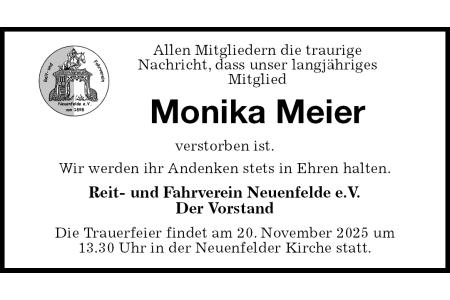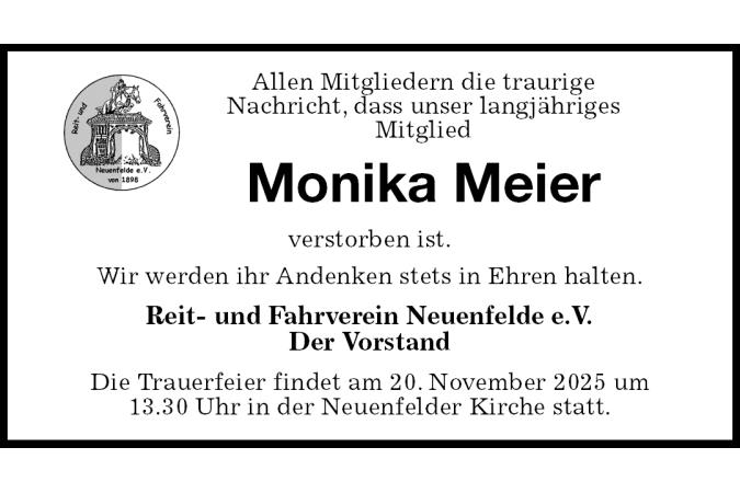 Allen Mitgliedern die traurigeNachricht, dass unser langjährigesMitgliedMonika Meierverstorben ist. Wir werden ihr Andenken stets in Ehren halten. Reit- und Fahrverein Neuenfelde e.V. Der Vorstand Die Trauerfeier findet am 20. November 2025 um13.30 Uhr in der Neuenfelder Kirche statt.