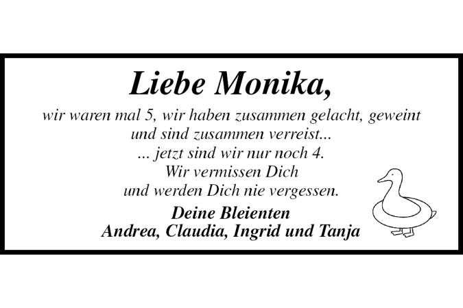Liebe Monika, wir waren mal 5, wir haben zusammen gelacht, geweint und sind zusammen verreist...... jetzt sind wir nur noch 4.Wir vermissen Dichund werden Dich nie vergessen. Deine BleientenAndrea, Claudia, Ingrid und Tanja