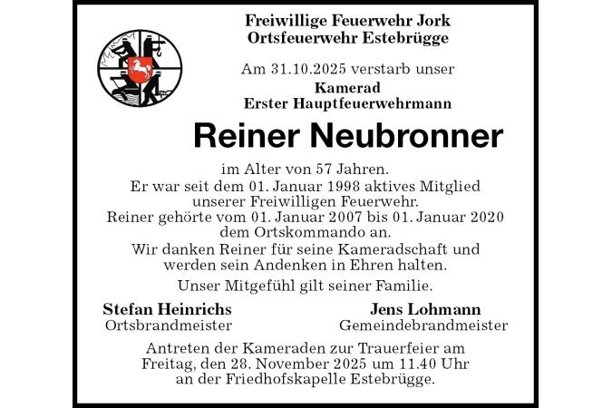 Freiwillige Feuerwehr Jork Ortsfeuerwehr Estebrügge Am 31.10.2025 verstarb unser Kamerad Erster Hauptfeuerwehrmann Reiner Neubronner im Alter von 57 Jahren. Er war seit dem 01. Januar 1998 aktives Mitgliedunserer Freiwilligen Feuerwehr.Reiner gehörte vom 01. Januar 2007 bis 01. Januar 2020 dem Ortskommando an. Wir danken Reiner für seine Kameradschaft undwerden sein Andenken in Ehren halten. Unser Mitgefühl gilt seiner Familie. Stefan HeinrichsJens Lohmann OrtsbrandmeisterGemeindebrandmeister Antreten der Kameraden zur Trauerfeier amFreitag, den 28. November 2025 um 11.40 Uhran der Friedhofskapelle Estebrügge.