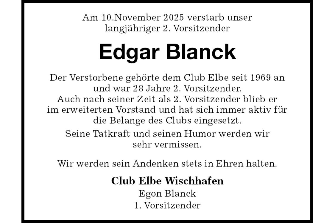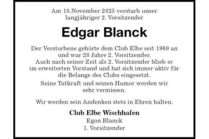 Am 10.November 2025 verstarb unserlangjähriger 2. VorsitzenderEdgar Blanck Der Verstorbene gehörte dem Club Elbe seit 1969 an und war 28 Jahre 2. Vorsitzender.Auch nach seiner Zeit als 2. Vorsitzender blieb erim erweiterten Vorstand und hat sich immer aktiv für die Belange des Clubs eingesetzt. Seine Tatkraft und seinen Humor werden wirsehr vermissen.Wir werden sein Andenken stets in Ehren halten. Club Elbe Wischhafen Egon Blanck 1. Vorsitzender