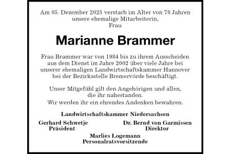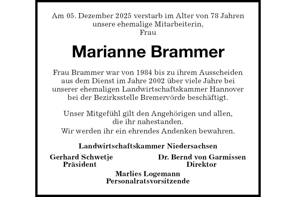 Am 05. Dezember 2025 verstarb im Alter von 78 Jahren unsere ehemalige Mitarbeiterin,FrauMarianne Brammer Frau Brammer war von 1984 bis zu ihrem Ausscheiden aus dem Dienst im Jahre 2002 über viele Jahre beiunserer ehemaligen Landwirtschaftskammer Hannover bei der Bezirksstelle Bremervörde beschäftigt. Unser Mitgefühl gilt den Angehörigen und allen,die ihr nahestanden. Wir werden ihr ein ehrendes Andenken bewahren. Landwirtschaftskammer Niedersachsen Gerhard SchwetjeDr. Bernd von Garmissen PräsidentDirektor Marlies Logemann Personalratsvorsitzende