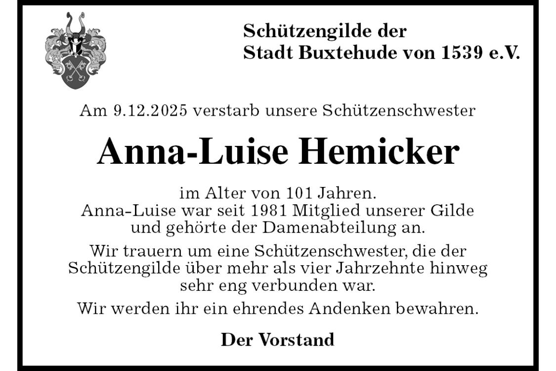 Schützengilde der Stadt Buxtehude von 1539 e.V. Am 9.12.2025 verstarb unsere Schützenschwester Anna-Luise Hemicker im Alter von 101 Jahren.Anna-Luise war seit 1981 Mitglied unserer Gildeund gehörte der Damenabteilung an. Wir trauern um eine Schützenschwester, die derSchützengilde über mehr als vier Jahrzehnte hinwegsehr eng verbunden war. Wir werden ihr ein ehrendes Andenken bewahren. Der Vorstand