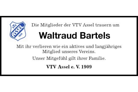 Die Mitglieder der VTV Assel trauern um Waltraud Bartels Mit ihr verlieren wie ein aktives und langjährigesMitglied unseres Vereins. Unser Mitgefühl gilt ihrer Familie. VTV Assel e. V. 1909