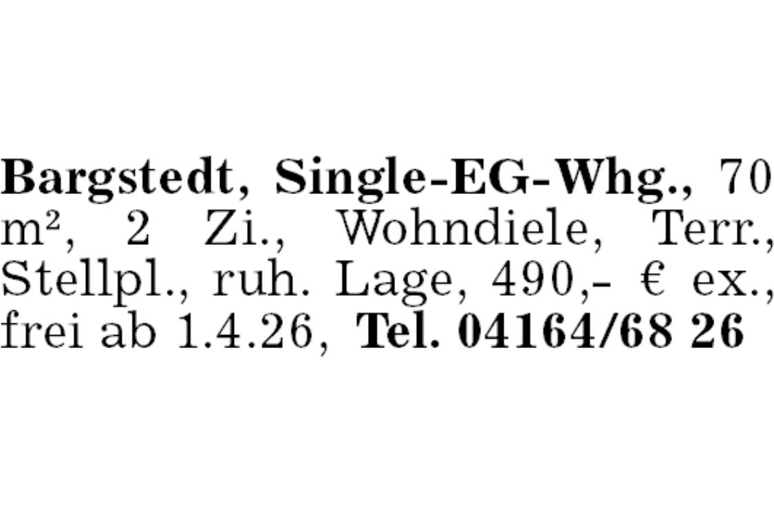 Bargstedt, Single-EG-Whg., 70 m², 2 Zi., Wohndiele, Terr., Stellpl., ruh. Lage, 490,- € ex., frei ab 1.4.26, Tel. 04164/68 26