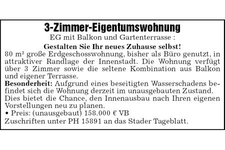 3-Zimmer-EigentumswohnungEG mit Balkon und Gartenterrasse : Gestalten Sie Ihr neues Zuhause selbst! 80 m² große Erdgeschosswohnung, bisher als Büro genutzt, inattraktiver Randlage der Innenstadt. Die Wohnung verfügtüber 3 Zimmer sowie die seltene Kombination aus Balkonund eigener Terrasse. Besonderheit: Aufgrund eines beseitigten Wasserschadens be-findet sich die Wohnung derzeit im unausgebauten Zustand.Dies bietet die Chance, den Innenausbau nach Ihren eigenenVorstellungen neu zu planen.• Preis: (unausgebaut) 158.000 € VB Zuschriften unter PH 15891 an das Stader Tageblatt.