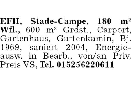 EFH, Stade-Campe, 180 m² Wfl., 600 m² Grdst., Carport, Gartenhaus, Gartenkamin, Bj. 1969, saniert 2004, Energieausw. in Bearb., von/an Priv. Preis VS, Tel. 015256220611