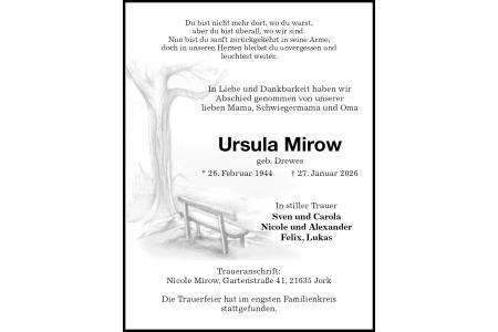 Du bist nicht mehr dort, wo du warst,aber du bist überall, wo wir sind.Nun bist du sanft zurückgekehrt in seine Arme,doch in unseren Herzen bleibst du unvergessen undleuchtest weiter. In Liebe und Dankbarkeit haben wirAbschied genommen von unsererlieben Mama, Schwiegermama und Oma Ursula Mirowgeb. Drewes * 26. Februar 1944† 27. Januar 2026In stiller Trauer Sven und Carola Nicole und Alexander Felix, Lukas Traueranschrift:Nicole Mirow, Gartenstraße 41, 21635 JorkDie Trauerfeier hat im engsten Familienkreisstattgefunden.