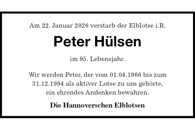 Am 22. Januar 2026 verstarb der Elblotse i.R. Peter Hülsen im 95. Lebensjahr. Wir werden Peter, der vom 01.04.1966 bis zum31.12.1994 als aktiver Lotse zu uns gehörte,ein ehrendes Andenken bewahren. Die Hannoverschen Elblotsen