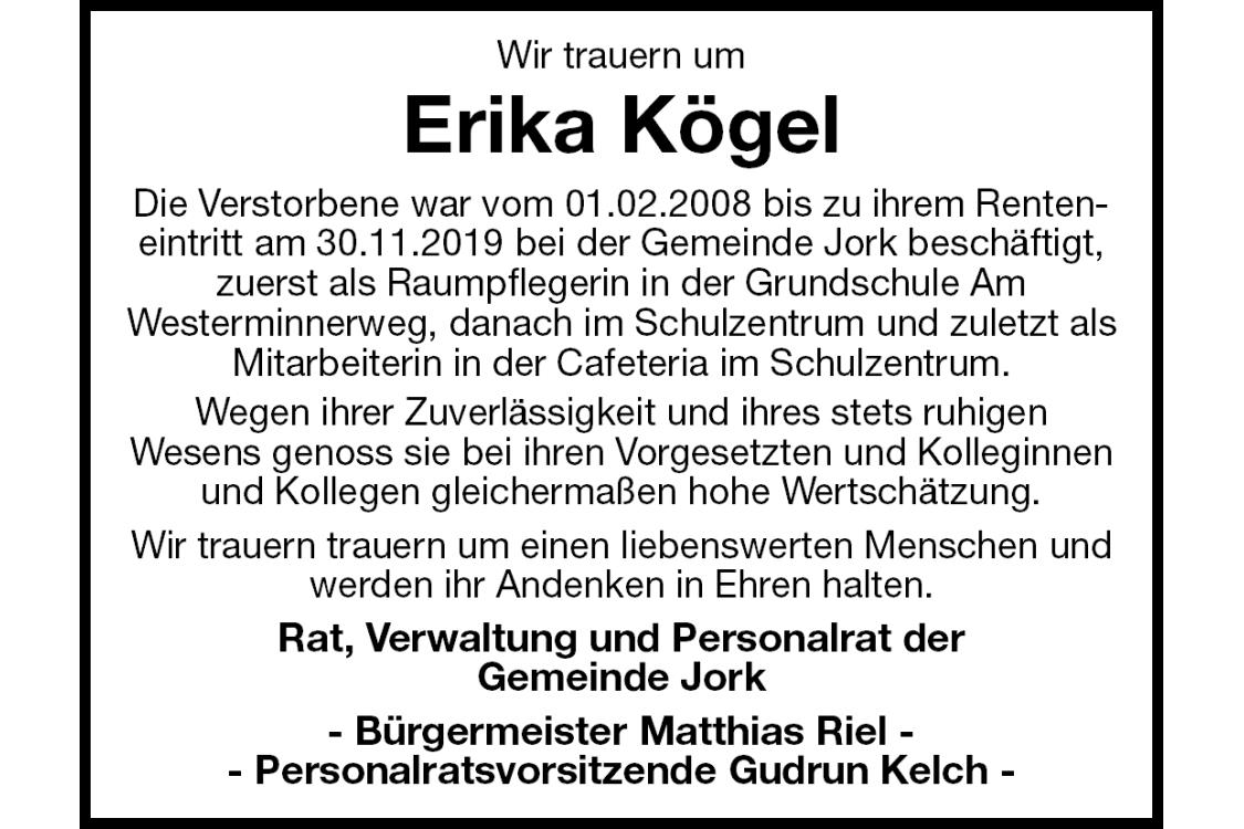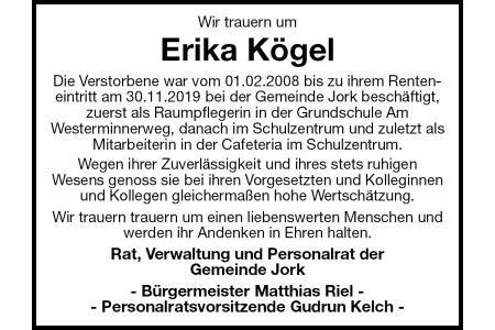 Wir trauern umErika Kögel Die Verstorbene war vom 01.02.2008 bis zu ihrem Renteneintritt am 30.11.2019 bei der Gemeinde Jork beschäftigt, zuerst als Raumpflegerin in der Grundschule AmWesterminnerweg, danach im Schulzentrum und zuletzt alsMitarbeiterin in der Cafeteria im Schulzentrum. Wegen ihrer Zuverlässigkeit und ihres stets ruhigenWesens genoss sie bei ihren Vorgesetzten und Kolleginnen und Kollegen gleichermaßen hohe Wertschätzung. Wir trauern trauern um einen liebenswerten Menschen und werden ihr Andenken in Ehren halten. Rat, Verwaltung und Personalrat derGemeinde Jork - Bürgermeister Matthias Riel -- Personalratsvorsitzende Gudrun Kelch -