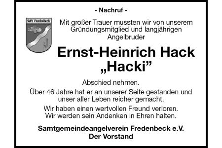- Nachruf - Mit großer Trauer mussten wir von unseremGründungsmitglied und langjährigenAngelbruderErnst-Heinrich Hack „Hacki” Abschied nehmen. Über 46 Jahre hat er an unserer Seite gestanden und unser aller Leben reicher gemacht. Wir haben einen wertvollen Freund verloren.Wir werden sein Andenken in Ehren halten. Samtgemeindeangelverein Fredenbeck e.V.Der Vorstand
