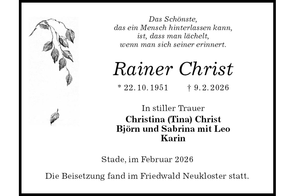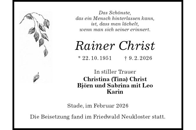 Das Schönste, das ein Mensch hinterlassen kann, ist, dass man lächelt, wenn man sich seiner erinnert. Rainer Christ * 22.10.1951† 9.2.2026In stiller Trauer Christina (Tina) Christ Björn und Sabrina mit Leo Karin Stade, im Februar 2026Die Beisetzung fand im Friedwald Neukloster statt.