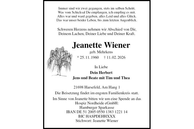 Immer sind wir zwei gegangen, stets im selben Schritt.Was vom Schicksal Du empfangen, ich empfing es mit.Alles war und ward gegeben, alles Leid und alles Glück.Das war unser beider Leben, bis zum letzten Augenblick. Schweren Herzens nehmen wir Abschied von Dir,Deinem Lachen, Deiner Liebe und Deiner Kraft. Jeanette Wiener geb. Mehrkens * 25.11.1960 † 11.02.2026 In Liebe Dein Herbert Jens und Beate mit Tim und Thea 21698 Harsefeld, Am Hang 1 Die Beisetzung findet im engsten Familienkreis statt. Im Sinne von Jeanette bitten wir um eine Spende an das Hospiz Nordheide eGmbH:Hamburger SparkasseIBAN DE 51 2005 0550 1383 1221 14BIC HASPDEHHXXXStichwort: Jeanette Wiener