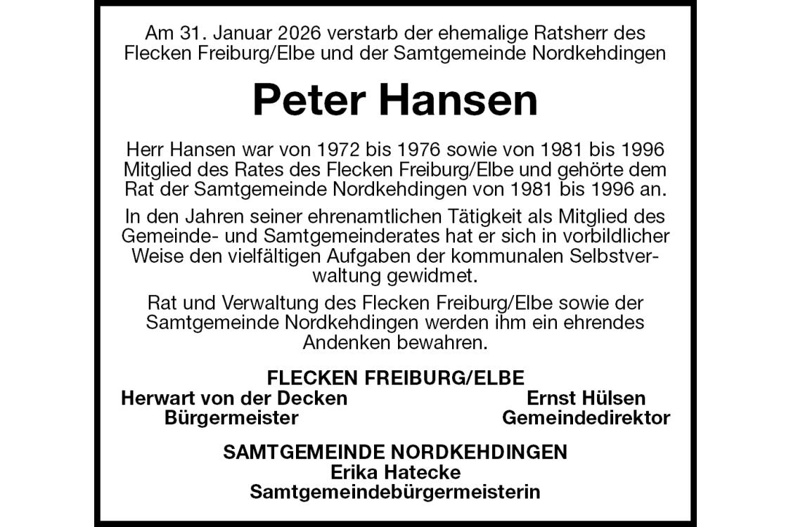Am 31. Januar 2026 verstarb der ehemalige Ratsherr desFlecken Freiburg/Elbe und der Samtgemeinde NordkehdingenPeter Hansen Herr Hansen war von 1972 bis 1976 sowie von 1981 bis 1996 Mitglied des Rates des Flecken Freiburg/Elbe und gehörte demRat der Samtgemeinde Nordkehdingen von 1981 bis 1996 an. In den Jahren seiner ehrenamtlichen Tätigkeit als Mitglied des Gemeinde- und Samtgemeinderates hat er sich in vorbildlicher Weise den vielfältigen Aufgaben der kommunalen Selbstverwaltung gewidmet. Rat und Verwaltung des Flecken Freiburg/Elbe sowie der Samtgemeinde Nordkehdingen werden ihm ein ehrendesAndenken bewahren. FLECKEN FREIBURG/ELBEHerwart von der DeckenErnst Hülsen BürgermeisterGemeindedirektor SAMTGEMEINDE NORDKEHDINGENErika HateckeSamtgemeindebürgermeisterin