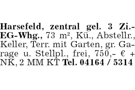 Harsefeld, zentral gel. 3 Zi.-EG-Whg., 73 m², Kü., Abstellr.,Keller, Terr. mit Garten, gr. Garage u. Stellpl., frei, 750,- € + NK, 2 MM KT Tel. 04164 / 5314