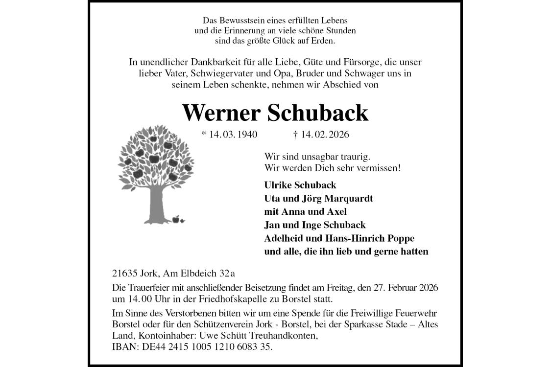 Das Bewusstsein eines erfüllten Lebensund die Erinnerung an viele schöne Stundensind das größte Glück auf Erden. In unendlicher Dankbarkeit für alle Liebe, Güte und Fürsorge, die unserlieber Vater, Schwiegervater und Opa, Bruder und Schwager uns inseinem Leben schenkte, nehmen wir Abschied von Werner Schuback * 14.03.1940 † 14.02.2026 Wir sind unsagbar traurig.Wir werden Dich sehr vermissen! Ulrike Schuback Uta und Jörg Marquardt mit Anna und Axel Jan und Inge Schuback Adelheid und Hans-Hinrich Poppe und alle, die ihn lieb und gerne hatten 21635 Jork, Am Elbdeich 32a Die Trauerfeier mit anschließender Beisetzung findet am Freitag, den 27. Februar 2026 um 14.00 Uhr in der Friedhofskapelle zu Borstel statt. Im Sinne des Verstorbenen bitten wir um eine Spende für die Freiwillige Feuerwehr Borstel oder für den Schützenverein Jork - Borstel, bei der Sparkasse Stade – Altes Land, Kontoinhaber: Uwe Schütt Treuhandkonten,IBAN: DE44 2415 1005 1210 6083 35.