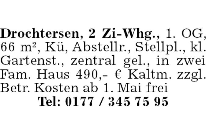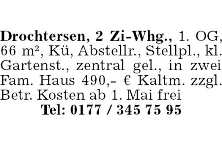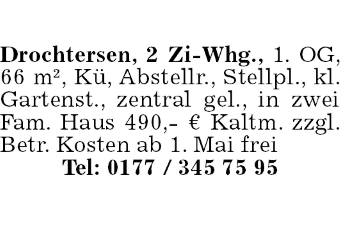 Drochtersen, 2 Zi-Whg., 1. OG, 66 m², Kü, Abstellr., Stellpl., kl. Gartenst., zentral gel., in zwei Fam. Haus 490,- € Kaltm. zzgl. Betr. Kosten ab 1. Mai frei Tel: 0177 / 345 75 95