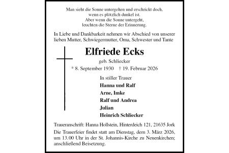 Man sieht die Sonne untergehen und erschrickt doch,wenn es plötzlich dunkel ist.Aber wenn die Sonne untergeht,leuchten die Sterne der Erinnerung. In Liebe und Dankbarkeit nehmen wir Abschied von unserer lieben Mutter, Schwiegermutter, Oma, Schwester und Tante Elfriede Ecks geb. Schliecker * 8. September 1930 † 19. Februar 2026 In stiller Trauer Hanna und Ralf Arne, Imke Ralf und Andrea Julian Heinrich Schliecker Traueranschrift: Hanna Hollstein, Hinterdeich 121, 21635 Jork Die Trauerfeier findet statt am Dienstag, dem 3. März 2026, um 13.00 Uhr in der St. Johannis-Kirche zu Neuenkirchen; anschließend Beisetzung.