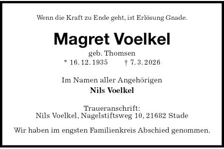 Wenn die Kraft zu Ende geht, ist Erlösung Gnade.Magret Voelkelgeb. Thomsen* 16.12.1935† 7.3.2026Im Namen aller Angehörigen