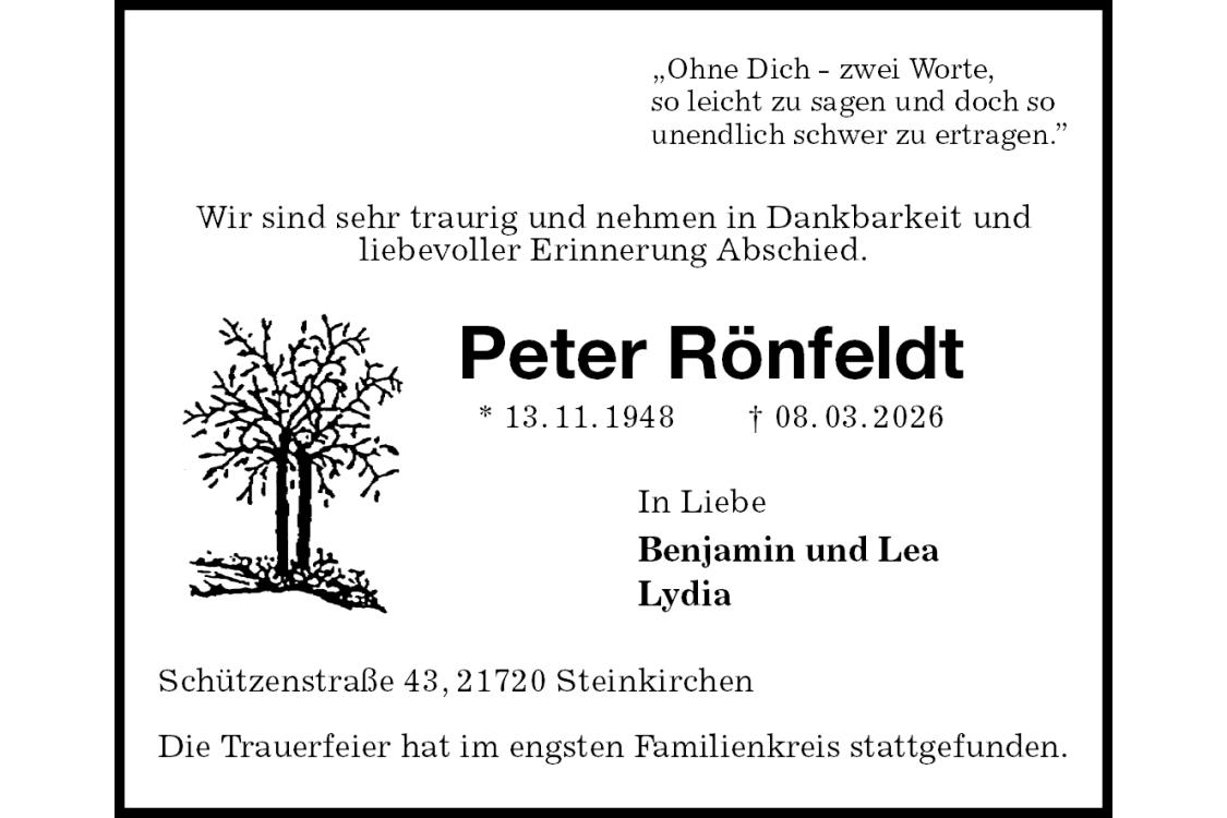 „Ohne Dich - zwei Worte,so leicht zu sagen und doch sounendlich schwer zu ertragen.”Wir sind sehr traurig und nehmen in Dankbarkeit undliebevoller Erinnerung Abschied.Peter Rönfeldt* 13.11.1948† 08.03.2026In Liebe Benjamin und Lea Lydia Schützenstraße 43, 21720 Steinkirchen Die Trauerfeier hat im engsten Familienkreis stattgefunden.