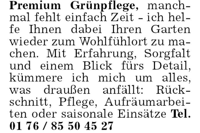 Premium Grünpflege, manchmal fehlt einfach Zeit - ich helfe Ihnen dabei Ihren Garten wieder zum Wohlfühlort zu machen. Mit Erfahrung, Sorgfalt und einem Blick fürs Detail, kümmere ich mich um alles, was draußen anfällt: Rückschnitt, Pflege, Aufräumarbeiten oder saisonale Einsätze Tel. 01 76 / 85 50 45 27