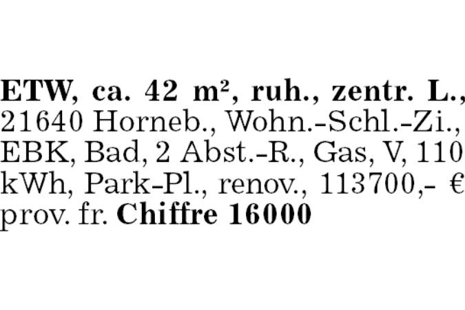 ETW, ca. 42 m², ruh., zentr. L., 21640 Horneb., Wohn.-Schl.-Zi., EBK, Bad, 2 Abst.-R., Gas, V, 110 kWh, Park-Pl., renov., 113700,- € prov. fr. Chiffre 16000
