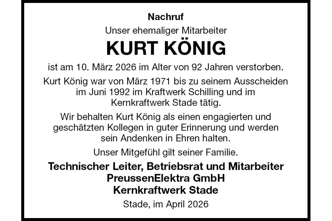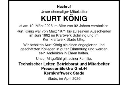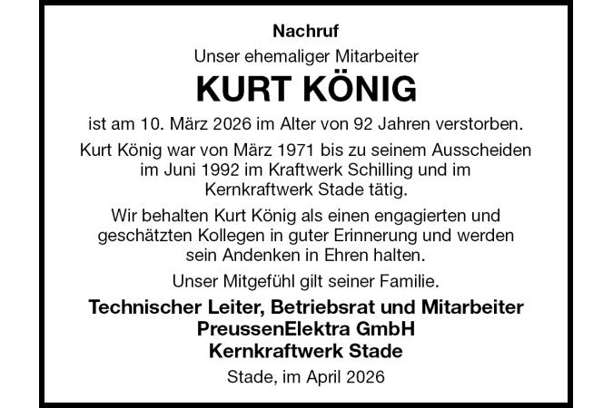 Nachruf Unser ehemaliger Mitarbeiter KURT KÖNIG ist am 10. März 2026 im Alter von 92 Jahren verstorben. Kurt König war von März 1971 bis zu seinem Ausscheiden im Juni 1992 im Kraftwerk Schilling und imKernkraftwerk Stade tätig. Wir behalten Kurt König als einen engagierten undgeschätzten Kollegen in guter Erinnerung und werdensein Andenken in Ehren halten. Unser Mitgefühl gilt seiner Familie. Technischer Leiter, Betriebsrat und MitarbeiterPreussenElektra GmbHKernkraftwerk Stade Stade, im April 2026