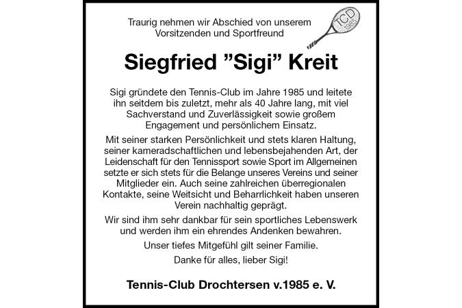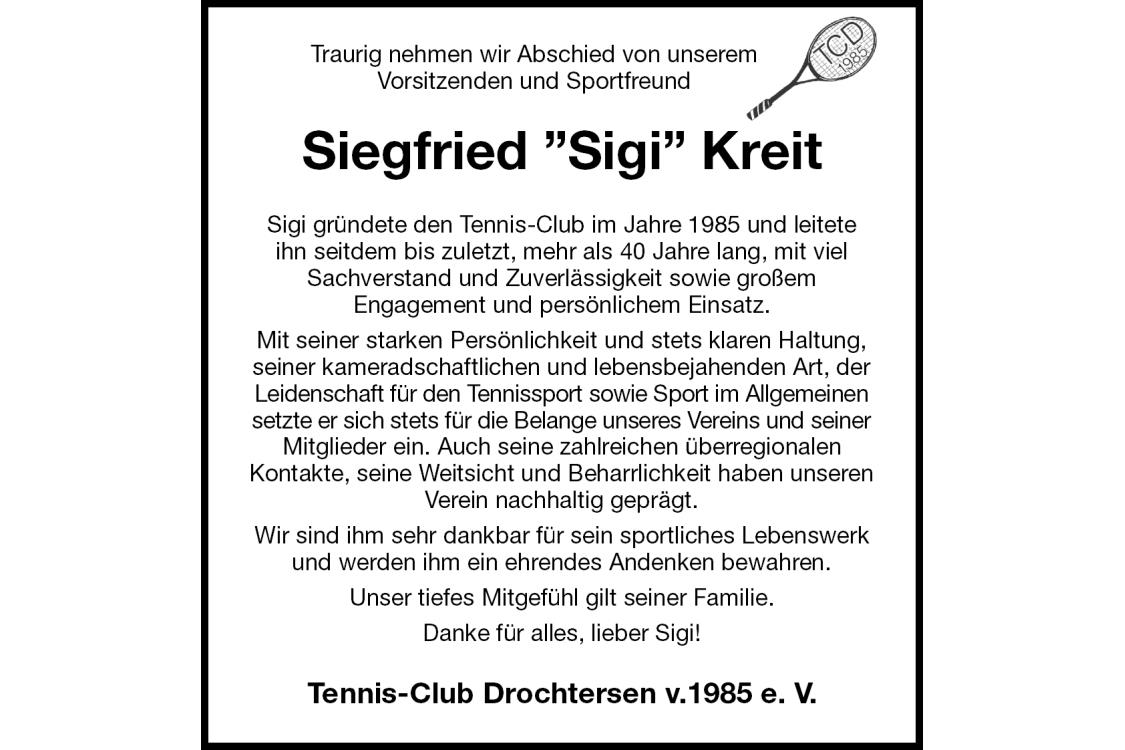 Traurig nehmen wir Abschied von unseremVorsitzenden und Sportfreund Siegfried ”Sigi” Kreit Sigi gründete den Tennis-Club im Jahre 1985 und leiteteihn seitdem bis zuletzt, mehr als 40 Jahre lang, mit viel Sachverstand und Zuverlässigkeit sowie großemEngagement und persönlichem Einsatz. Mit seiner starken Persönlichkeit und stets klaren Haltung, seiner kameradschaftlichen und lebensbejahenden Art, der Leidenschaft für den Tennissport sowie Sport im Allgemeinen setzte er sich stets für die Belange unseres Vereins und seiner Mitglieder ein. Auch seine zahlreichen überregionalenKontakte, seine Weitsicht und Beharrlichkeit haben unseren Verein nachhaltig geprägt. Wir sind ihm sehr dankbar für sein sportliches Lebenswerk und werden ihm ein ehrendes Andenken bewahren. Unser tiefes Mitgefühl gilt seiner Familie. Danke für alles, lieber Sigi! Tennis-Club Drochtersen v.1985 e. V.