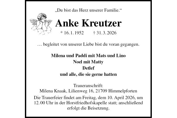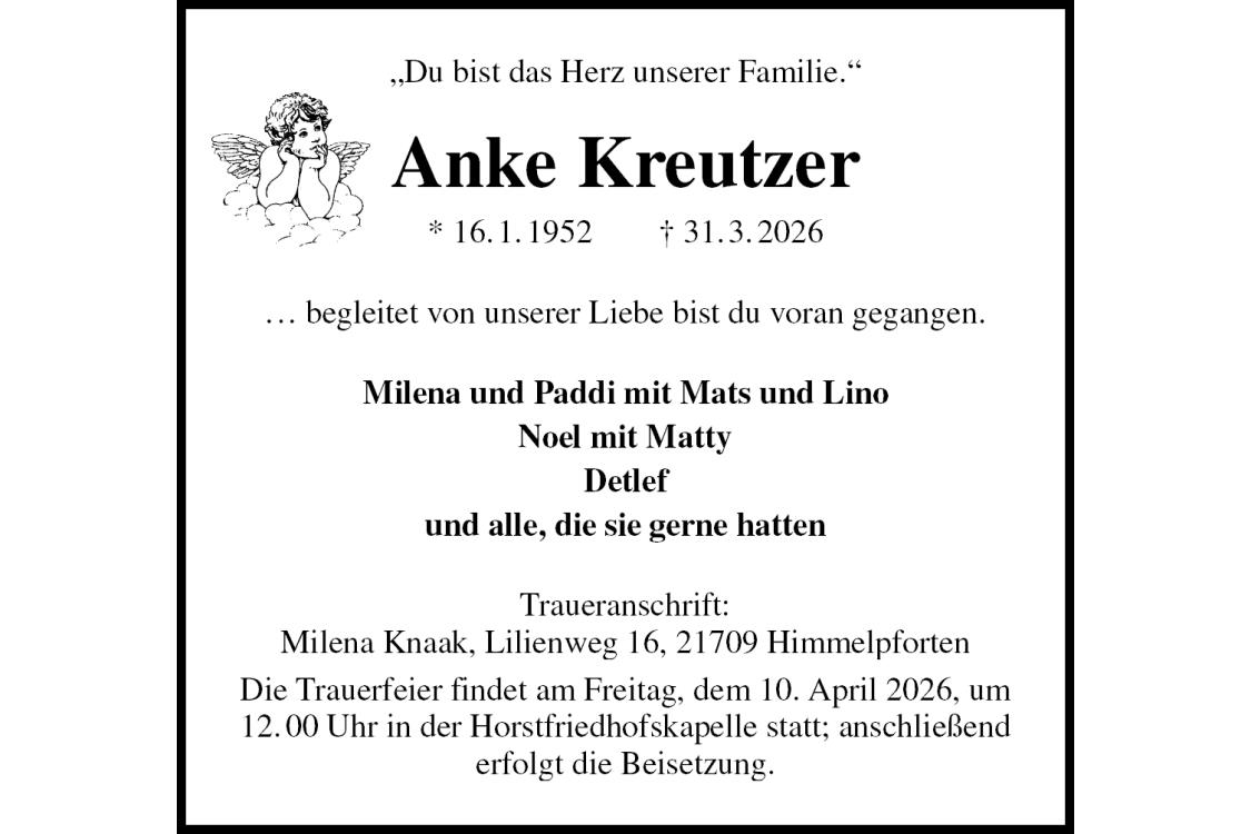 „Du bist das Herz unserer Familie.“ Anke Kreutzer * 16.1.1952 † 31.3.2026 … begleitet von unserer Liebe bist du voran gegangen. Milena und Paddi mit Mats und Lino Noel mit Matty Detlef und alle, die sie gerne hatten Traueranschrift:Milena Knaak, Lilienweg 16, 21709 Himmelpforten Die Trauerfeier findet am Freitag, dem 10. April 2026, um12.00 Uhr in der Horstfriedhofskapelle statt; anschließenderfolgt die Beisetzung.