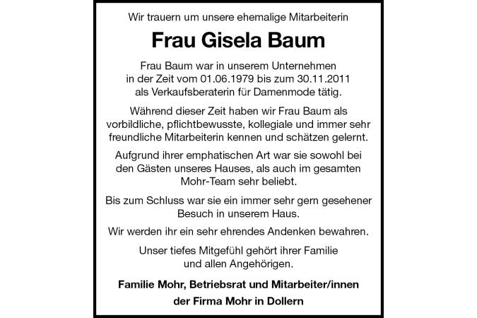 Wir trauern um unsere ehemalige Mitarbeiterin Frau Gisela Baum Frau Baum war in unserem Unternehmenin der Zeit vom 01.06.1979 bis zum 30.11.2011als Verkaufsberaterin für Damenmode tätig. Während dieser Zeit haben wir Frau Baum alsvorbildliche, pflichtbewusste, kollegiale und immer sehrfreundliche Mitarbeiterin kennen und schätzen gelernt. Aufgrund ihrer emphatischen Art war sie sowohl beiden Gästen unseres Hauses, als auch im gesamtenMohr-Team sehr beliebt. Bis zum Schluss war sie ein immer sehr gern gesehener Besuch in unserem Haus. Wir werden ihr ein sehr ehrendes Andenken bewahren. Unser tiefes Mitgefühl gehört ihrer Familieund allen Angehörigen. Familie Mohr, Betriebsrat und Mitarbeiter/innen der Firma Mohr in Dollern