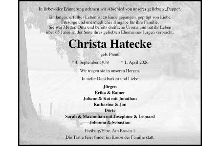 In liebevoller Erinnerung nehmen wir Abschied von unserer geliebten „Puppe“. Ein langes, erfülltes Leben ist zu Ende gegangen, geprägt von Liebe,Fürsorge und unermüdlicher Hingabe für ihre Familie.Sie war Mutter, Oma und bereits dreifache Uroma und hat ihr Lebenüber 65 Jahre an der Seite ihres geliebten Ehemannes Jürgen verbracht. Christa Hatecke geb. Preuß * 4. September 1938 † 1. April 2026 Wir tragen sie in unseren Herzen. In tiefer Dankbarkeit und Liebe Jürgen Erika & Rainer Juliane & Kai mit Jonathan Katharina & Jan Dörte Sarah & Maximilian mit Josephine & Leonard Johanna & Sebastian Freiburg/Elbe, Am Bassin 1 Die Trauerfeier findet im Kreise der Familie statt.