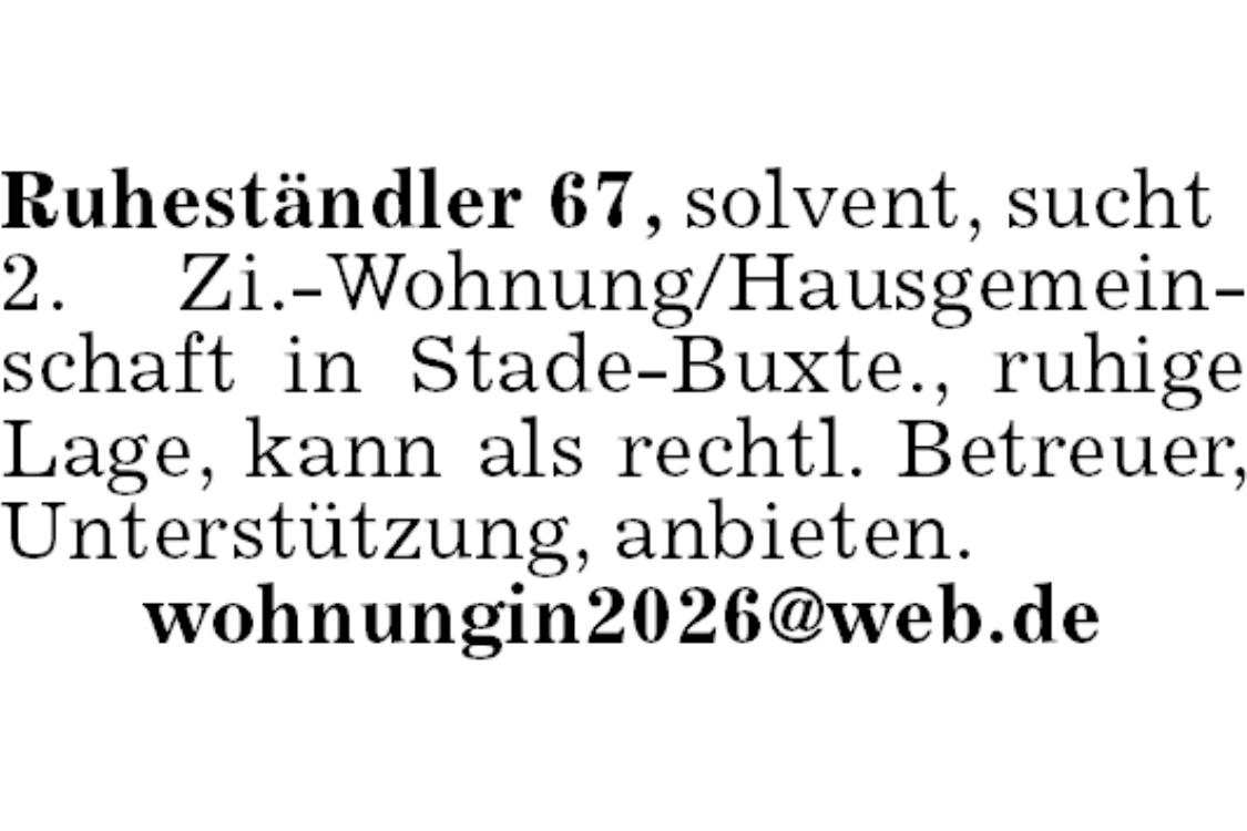 Ruheständler 67, solvent, sucht 2. Zi.-Wohnung/Hausgemeinschaft in Stade-Buxte., ruhige Lage, kann als rechtl. Betreuer, Unterstützung, anbieten. wohnungin2026@web.de