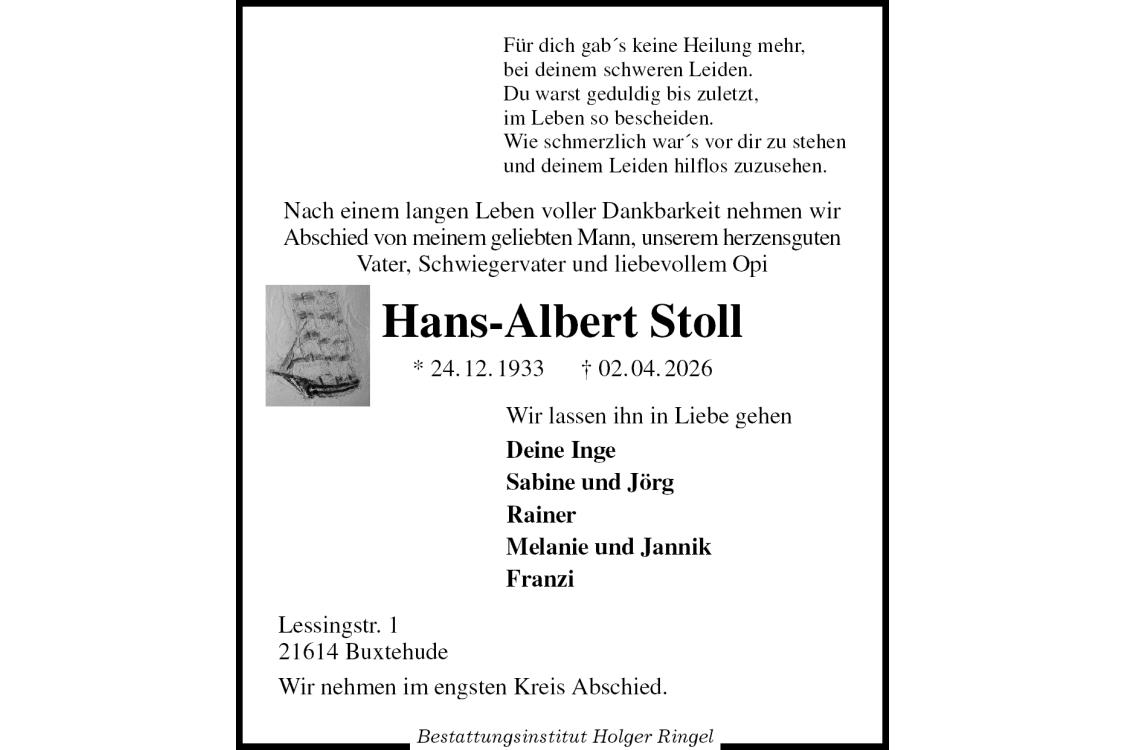 Für dich gab´s keine Heilung mehr,bei deinem schweren Leiden.Du warst geduldig bis zuletzt,im Leben so bescheiden.Wie schmerzlich war´s vor dir zu stehenund deinem Leiden hilflos zuzusehen. Nach einem langen Leben voller Dankbarkeit nehmen wir Abschied von meinem geliebten Mann, unserem herzensguten Vater, Schwiegervater und liebevollem Opi Hans-Albert Stoll * 24.12.1933 † 02.04.2026 Wir lassen ihn in Liebe gehen Deine Inge Sabine und Jörg Rainer Melanie und Jannik Franzi Lessingstr. 121614 Buxtehude Wir nehmen im engsten Kreis Abschied. Bestattungsinstitut Holger Ringel