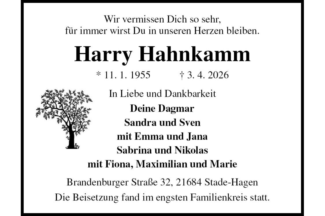 Wir vermissen Dich so sehr,für immer wirst Du in unseren Herzen bleiben. Harry Hahnkamm * 11. 1. 1955 † 3. 4. 2026 In Liebe und Dankbarkeit Deine Dagmar Sandra und Sven mit Emma und Jana Sabrina und Nikolas mit Fiona, Maximilian und Marie Brandenburger Straße 32, 21684 Stade-Hagen Die Beisetzung fand im engsten Familienkreis statt.