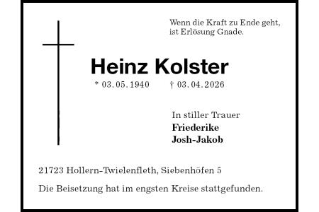 Wenn die Kraft zu Ende geht,ist Erlösung Gnade. Heinz Kolster* 03.05.1940† 03.04.2026In stiller Trauer Friederike Josh-Jakob 21723 Hollern-Twielenfleth, Siebenhöfen 5Die Beisetzung hat im engsten Kreise stattgefunden.