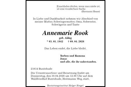 Einschlafen dürfen, wenn man müde ist,ist eine wunderbare Sache. (Hermann Hesse) In Liebe und Dankbarkeit nehmen wir Abschied vonmeiner Mutter, Schwiegermutter, Oma, Schwester,Schwägerin und Tante Annemarie Rook geb. Aldag * 03. 01. 1942 † 09. 04. 2026 Das Leben endet, die Liebe bleibt. Torben und Ramona Jonas und alle, die ihr nahestanden. 21614 Buxtehude Die Urnentrauerfeier und Beisetzung findet amDonnerstag, den 30.04.2026 um 12.00 Uhr auf demWaldfriedhof Buxtehude, Heitmanns Weg, statt. Bestattungsinstitut Holger Ringel