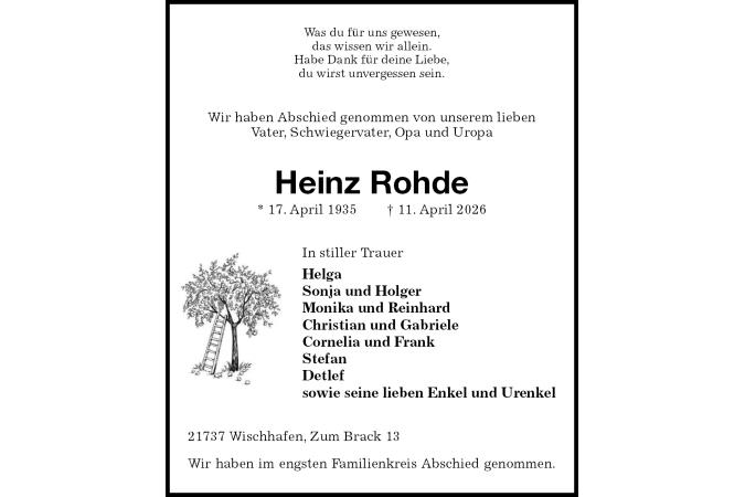 Was du für uns gewesen,das wissen wir allein.Habe Dank für deine Liebe,du wirst unvergessen sein. Wir haben Abschied genommen von unserem liebenVater, Schwiegervater, Opa und Uropa Heinz Rohde* 17. April 1935† 11. April 2026In stiller Trauer Helga Sonja und Holger Monika und Reinhard Christian und Gabriele Cornelia und Frank Stefan Detlef sowie seine lieben Enkel und Urenkel 21737 Wischhafen, Zum Brack 13 Wir haben im engsten Familienkreis Abschied genommen.