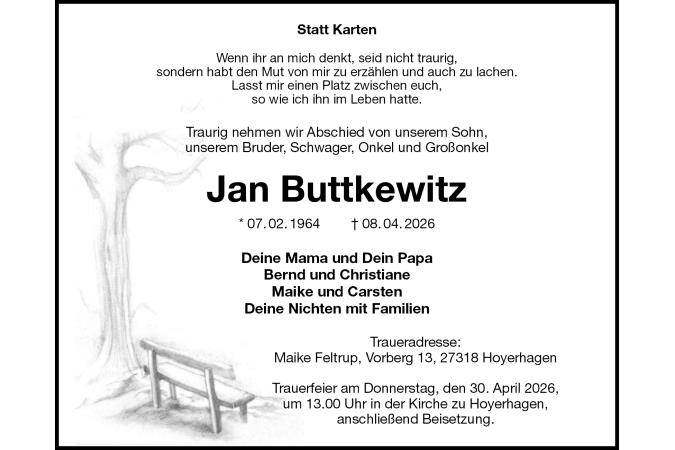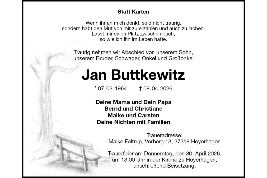 Statt Karten Wenn ihr an mich denkt, seid nicht traurig,sondern habt den Mut von mir zu erzählen und auch zu lachen.Lasst mir einen Platz zwischen euch,so wie ich ihn im Leben hatte. Traurig nehmen wir Abschied von unserem Sohn,unserem Bruder, Schwager, Onkel und GroßonkelJan Buttkewitz * 07.02.1964† 08.04.2026 Deine Mama und Dein PapaBernd und ChristianeMaike und CarstenDeine Nichten mit Familien Traueradresse:Maike Feltrup, Vorberg 13, 27318 HoyerhagenTrauerfeier am Donnerstag, den 30. April 2026,um 13.00 Uhr in der Kirche zu Hoyerhagen,anschließend Beisetzung.
