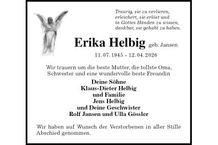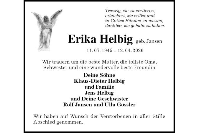Traurig, sie zu verlieren, erleichert, sie erlöst und in Gottes Händen zu wissen, dankbar, sie gehabt zu haben. Erika Helbig geb. Jansen 11.07.1945 - 12.04.2026 Wir trauern um die beste Mutter, die tollste Oma, Schwester und eine wundervolle beste Freundin Deine Söhne Klaus-Dieter Helbig und Familie Jens Helbig und Deine Geschwister Rolf Jansen und Ulla Gössler Wir haben auf Wunsch der Verstorbenen in aller Stille Abschied genommen.